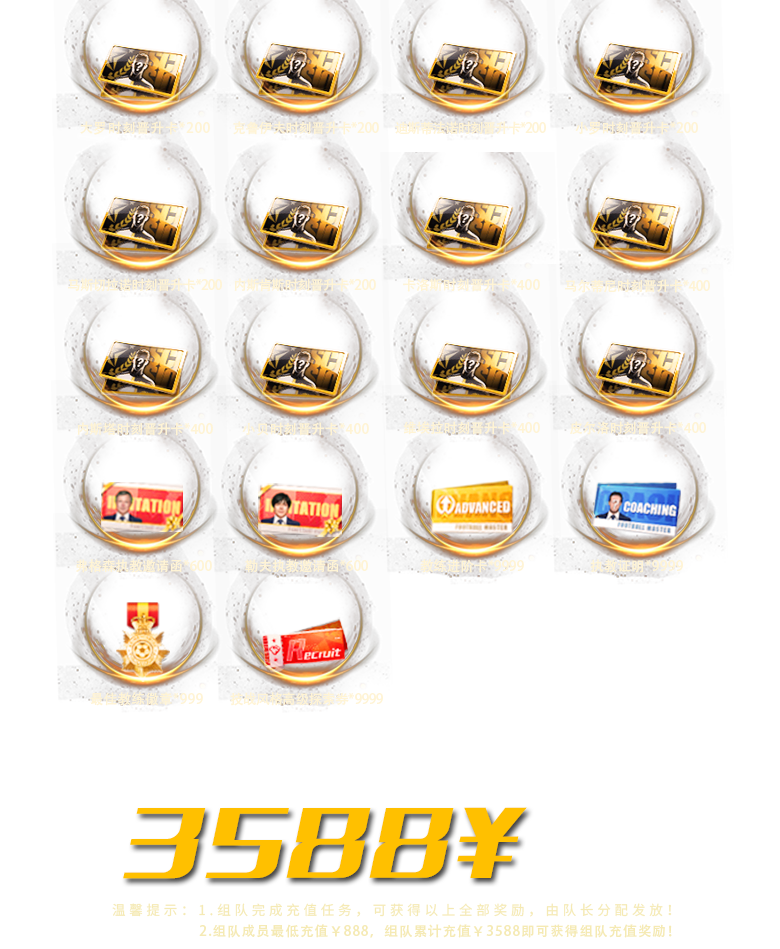 当组队成员累计充值达到3588¥,且成员均充值达到888¥,即可由组队创建者分配奖励;